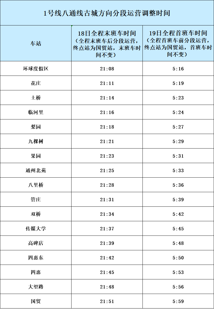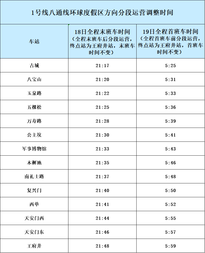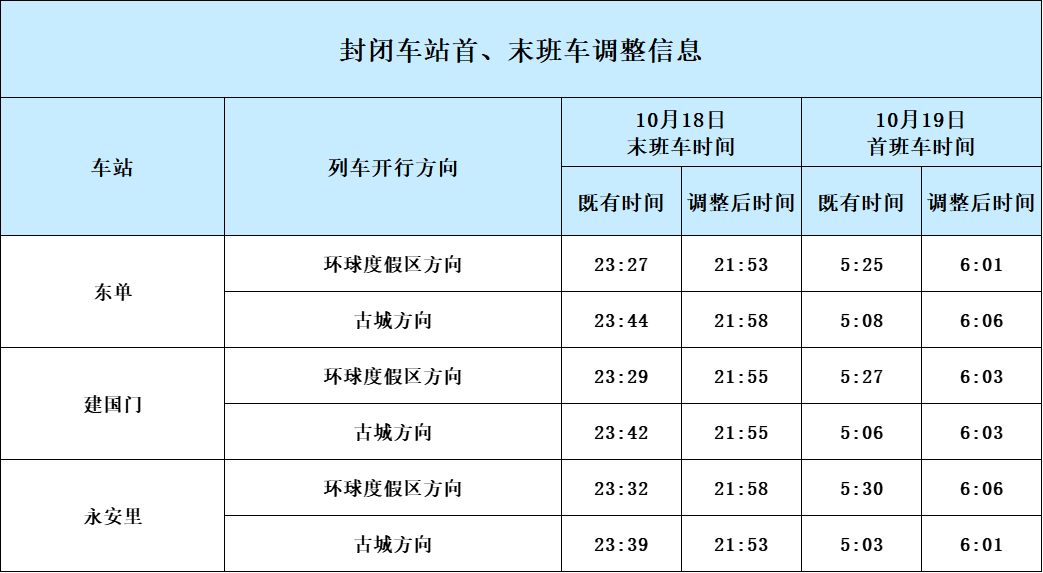 为配合1号线道岔设备施工改造,2025年10月18日22时至2025年10月19日6时,地铁1号线建国门站、东单站、永安里站封闭,换乘站停止换乘,2号线建国门站、5号线东单站保持运营;地铁1号线八通线分段运营,运营区段调整为古城-王府井、国贸-环球度假区,古城站开往环球度假区站方向的列车终点站调整为王府井站,环球度假区站开往古城站方向的列车终点站调整为国贸站。请您合理安排出行,感谢您的理解与配合。